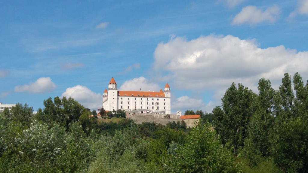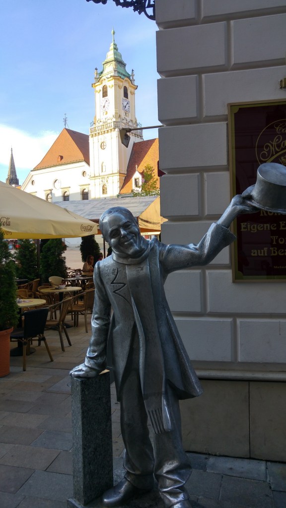 Llegamos a Bratislava. Su castillo Bratislavsky que domina el paisaje, se empezó en el siglo IX y actualmente es el Museo Nacional Eslovaco. Su centro medieval merece una visita la puerta de San Miguel y la iglesia Azul, sin olvidarnos de sus famosas esculturas callejeras.