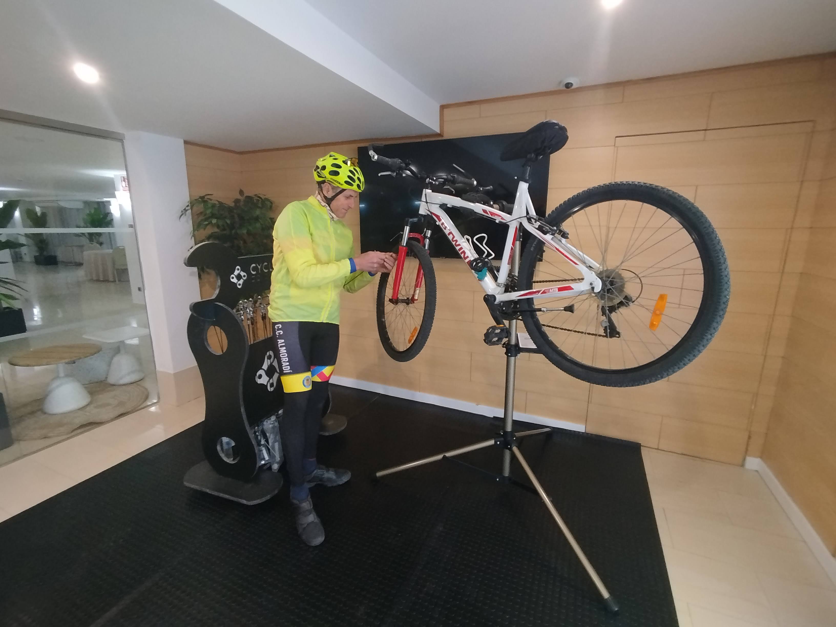 Nuestra experiencia arranca en el Hotel Daniya de Dénia. Nada más llegar, disfrutamos de un entorno muy orientado a la bicicleta, con modelos de alquiler disponibles en el mismo hall. Tras visitar sus instalaciones, queda patente su apuesta por nuestro sector. Desde Funbici.org, siguiendo nuestra filosofía de apoyar a quienes fomentan la movilidad sostenible, avalamos este tipo de infraestructuras que facilitan la logística del viaje con alforjas.