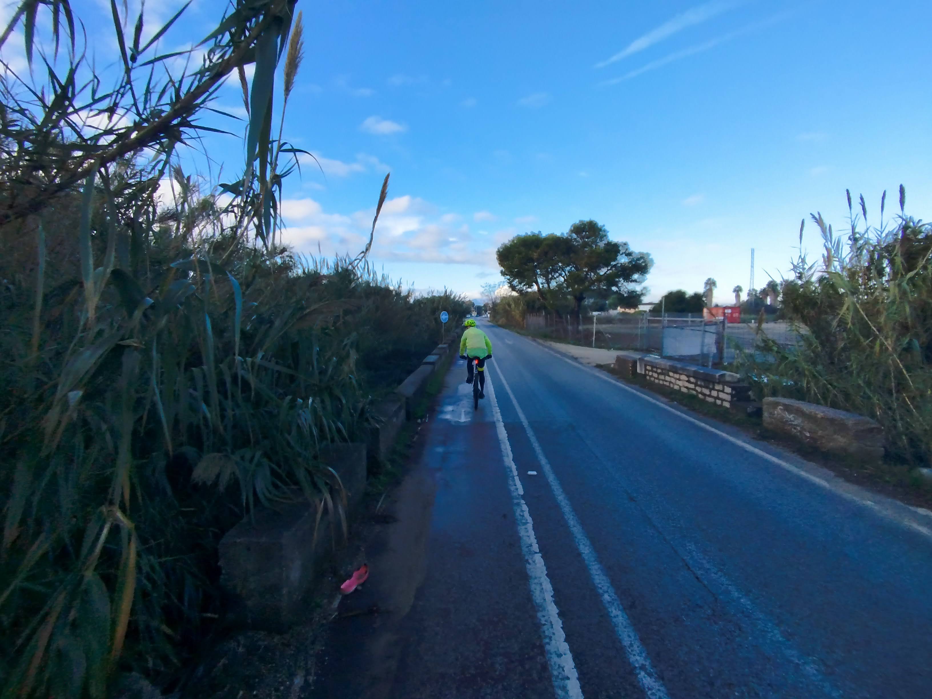 Desde allí, enlazamos con lo que denominamos la Ruta Ecológica de Gorgos: un itinerario asfaltado, envuelto en el verde de olivos y almendros, que discurre junto al río. Tuvimos la fortuna de ver el Riu Gorgos con agua, un espectáculo poco común fruto de las lluvias recientes.