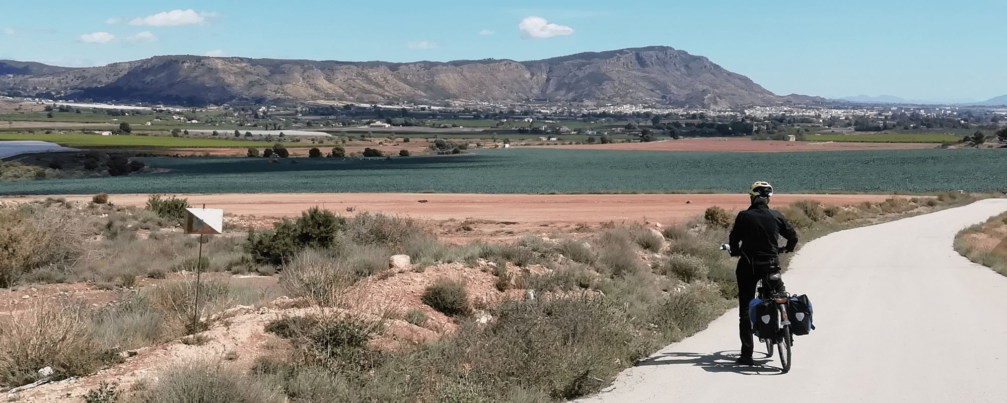 Retomamos nuestro camino para dirigirnos a uno de los tramos más bellos de nuestra ruta: siempre bajo la compañía de la Sierra de Carrascoy, recorreremos infinitas plantaciones de todo tipo de verduras y cítricos hasta alcanzar las proximidades de Murcia.