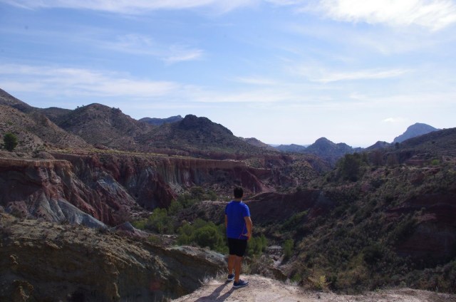 Seguimos avanzando por nuestro camino, y nos detenemos para realizar fotos espectaculares de los terrenos arcillosos altamente erosionados por las escasas, pero intensas lluvias, a menudo torrenciales, típicas del sureste español. Sin embargo, sorprende la frondosidad del cauce del río, verdoso en prácticamente todo su transcurso. Aprovechamos estos momentos para hidratarnos e ingerir alimentos de alto valor calórico.