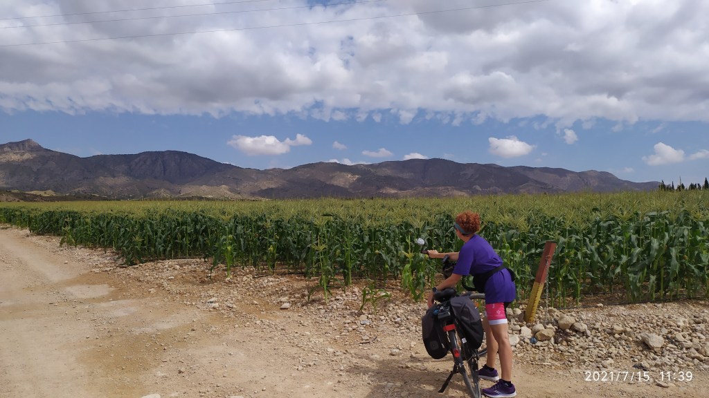 Al recorrer este tramo de la ruta nos sorprende el contraste entre las tierras regadas y cultivadas, frente a las que sólo reciben el agua que corresponde a estas zonas áridas del sur de la Comunitat Valenciana.